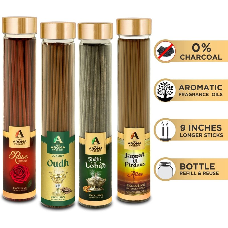 The Aroma Factory Organic Incense Sticks Aromatic Fragrances | Rose, Attar Jannat-ul-Firdaus, Oudh & Loban | No Charcoal, Scented Incense | Herbal Pooja Agarbatti | 4x100g Jute Bag Giftset