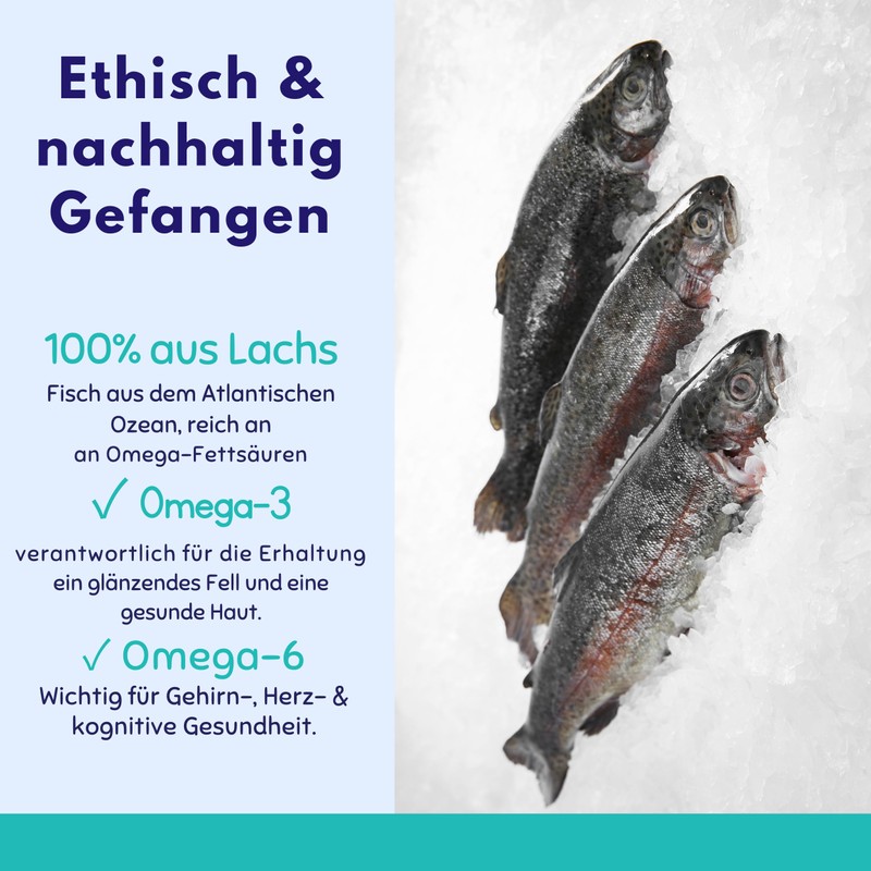 Our 100% natural salmon oil is sustainably sourced from high-quality salmon - without offal, no artificial additives. Gentle filtering preserves all valuable omega-3 and omega-6 fatty acids, EPA and DHA, which support your pet's skin, coat, joints and immune system. Perfect for dogs and cats of all ages - whether for daily feeding or as targeted support during the coat changing time.
