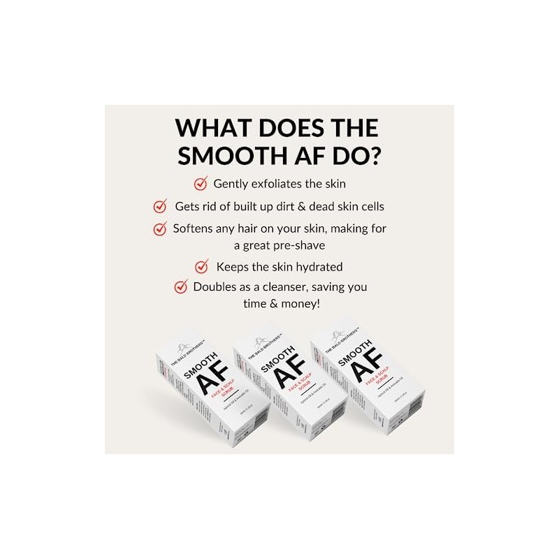 • THE SMOOTH AF - The Smooth AF exfoliate scrub does an excellent job of removing any dead skin and dirt found on your face & scalp. The scrub is not too strong, so it will not damage your sensitive face & scalp skin. It also softens any hairs, making for the perfect pre shave! On top of that, it doubles as a cleanser, saving you time & money!