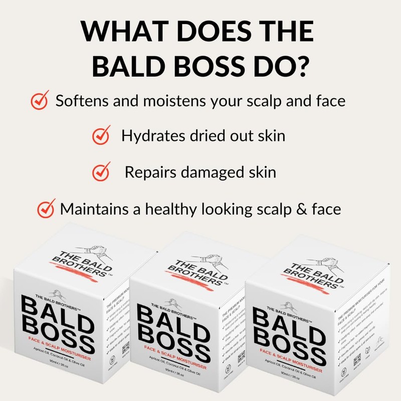 - 100% VEGAN - At The Bald Brothers, we will never use animal products in any of our products. The Bald Boss bald head moisturizer for men is proudly made with vegan ingredients only, which your skin will love!