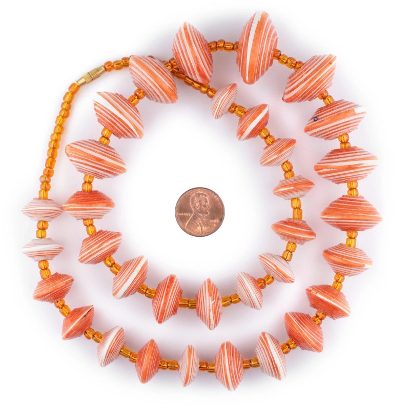 Beautiful strand of larger size red and white recycled paper beads. These beads are made using recycled paper by working mothers in Uganda. Each bead is fair trade and handmade with love. Individual beads range in size from 8-13mm wide and 14-30mm in diameter with about 32 beads on each strand. Some beads may show slight sign of use, as they have passed through hands at African markets. Beads may vary slightly from photo as each strand is individually made by hand.