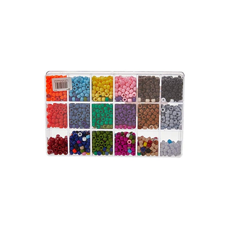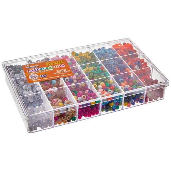 BEADERY-Bead Extravaganza Box: Crayon Mix. This package contains approximately 2300 plastic pony beads in eighteen opaque colors. Each measures 1/4x1/4 inch. Recommended for ages 6 and up. Made in USA.