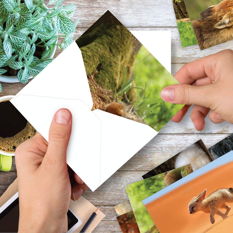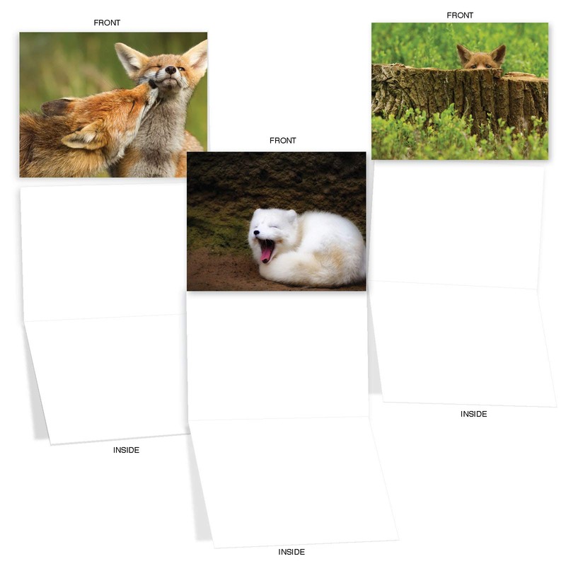- 10 BLANK NOTE CARDS - Inside text is blank with no greeting. These note cards featuring pictures of cute baby foxes hiding, sleeping, and playing in the wild will warm the hearts of your family members and friends. Add a little color and personality to any wedding, holiday, or thank you sentiment that you write with these beautiful note cards. Ships with envelopes and reusable box.