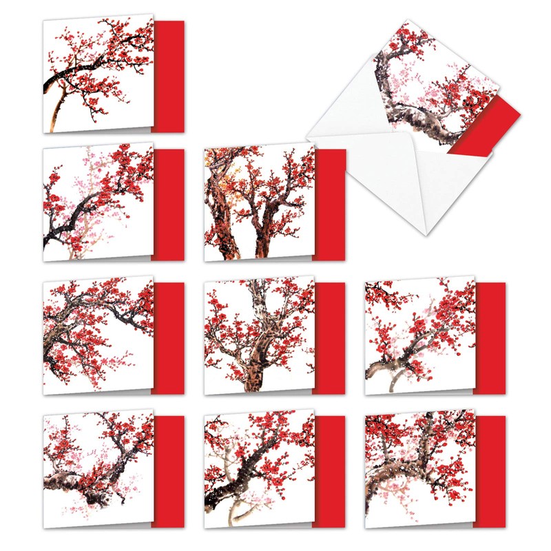 - 10 BLANK CARDS - The cherry blossom, or the sakura, is considered the national flower of Japan with its colorful petals. Share the gift of love, laughter and smiles this year with amazing colors and vibrant designs of floral designed cards. No matter the occasion, these cards are blank so you can write your personalized handwritten message inside.