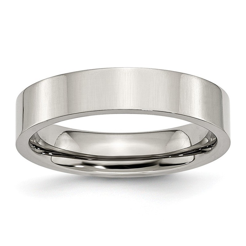 Sleek and simple with a contemporary flat profile designed from stainless steel with a high polished finish. This 5mm wide band also features a comfort fit interior or a rounded inside shank so it will slide easily and rest comfortably on the finger.