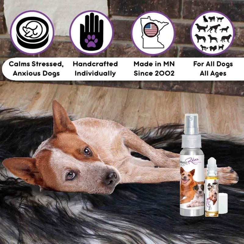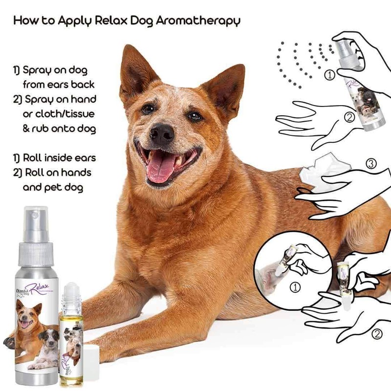 - Dog Calming Aromatherapy - Takes the edge of your dog's stress. Spray over dog from ears back, onto bedding, in their crate or on your hands and pet