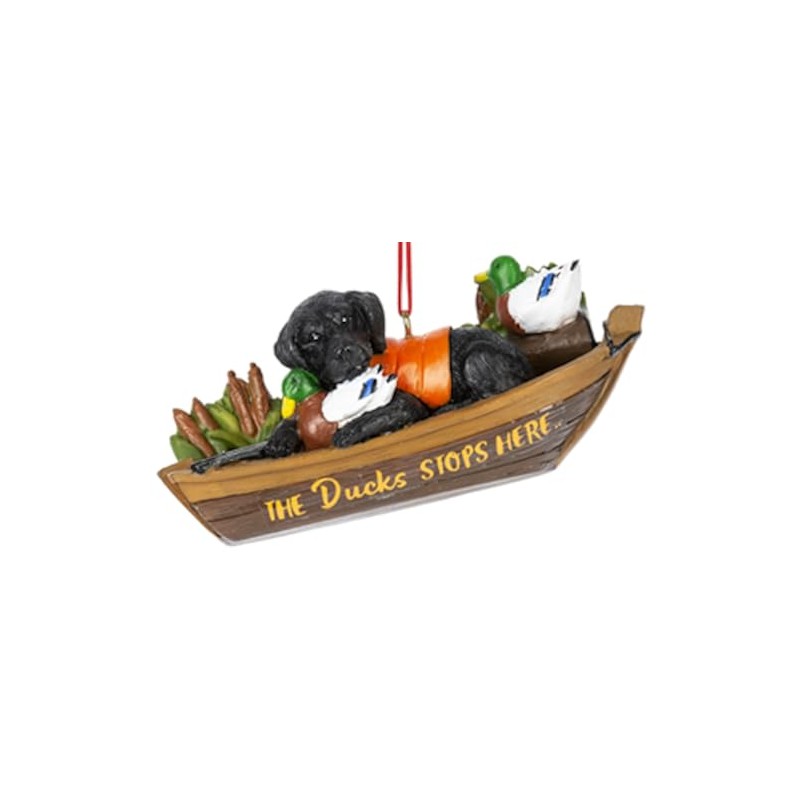 - Stylish Unique Design: Featuring a black lab pup in its hunting vest nestled on its hunting boat with ducks, gun, and all the hunting accessories, this design is sure to be a family favorite year after year and will spark coversation by all those who lay eyes on it. Whether you say Feliz Navidad, Mele Kelikimaka, Merry Christmas, or Happy Holidays, this ornament will be a welcome additon this season!