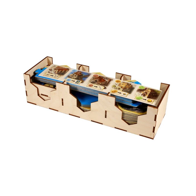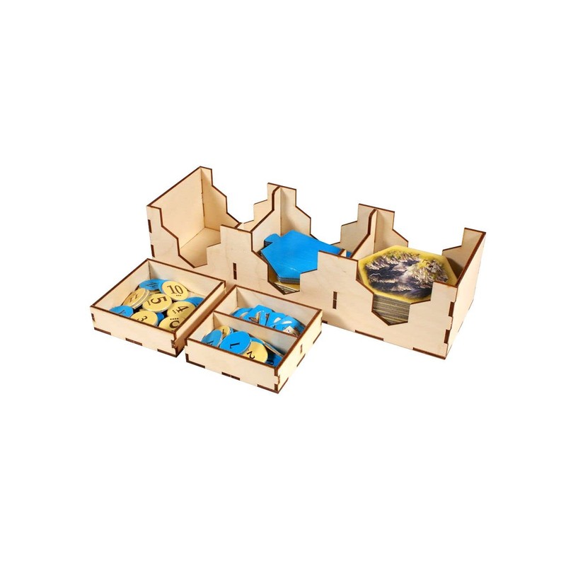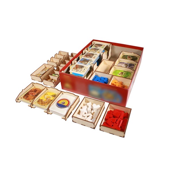 Build the road to your new settlement with a little help from The Broken Token! Features 16 removable trays: 6 Player Trays, 2 stackable card trays, 1 player reference tray, 1 tile tray, 2 token trays and 6 mini-expansion trays. Accommodates the base game and the 5-6 player extension, plus Frenemies and Oil Spring scenarios, in the base game box. Dimensions: 11.125” x 9” x 2.8” (282.5mm x 228.6mm x 71.12mm) This product is a kit that requires assembly. We recommend the use of wood glue (sold separately). Due to manufacturing, printing, and edition differences box sizes can vary and may not be compatible with the version our kits were designed for. Please measure the bottom inside of your game box to confirm fit for the organizer dimensions listed above. This is a third-party accessory designed by The Broken Token. All product names are trademarks of their respective owners, which are in no way associated or affiliated with The Broken Token.