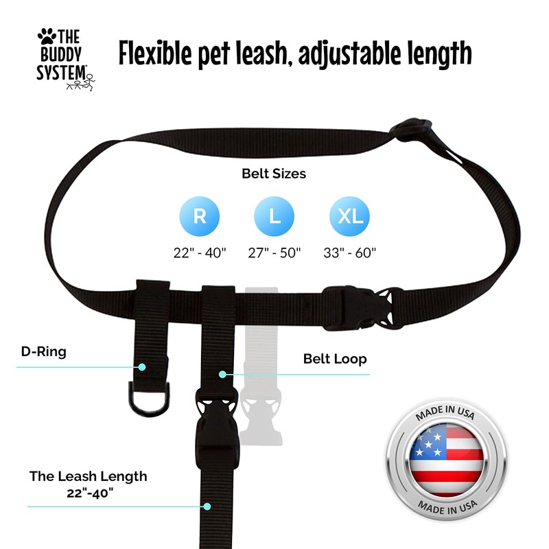 - FLEXIBLE PET LEASH, ADJUSTABLE LENGTH: Large Wasit Belt Size, adjustable between 27" - 50". Maintain a rigorous exercise program with the Buddy System Dog Leash size large that fits securely around your waist and extends. Leash size for all Regular Dog Systems 22" - 40"