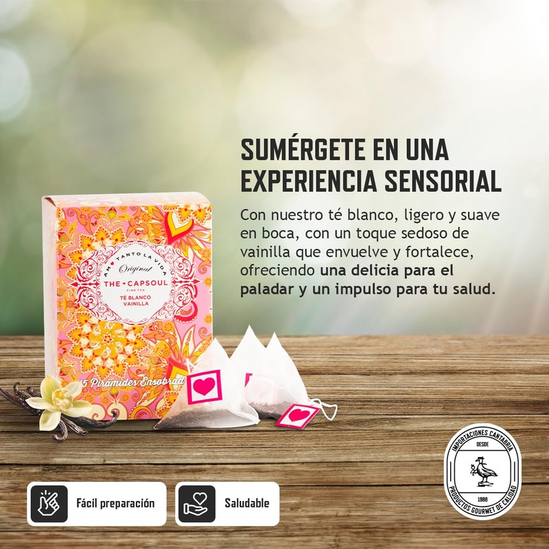 - En boca es ligero y aterciopelado, con toques de vainilla que le aportan calidez. Las sensaciones dulces que aporta la vainilla predominan y se desarrollan en el paladar. Esta original fórmula combina el frescor del té con la madurez de esta especia