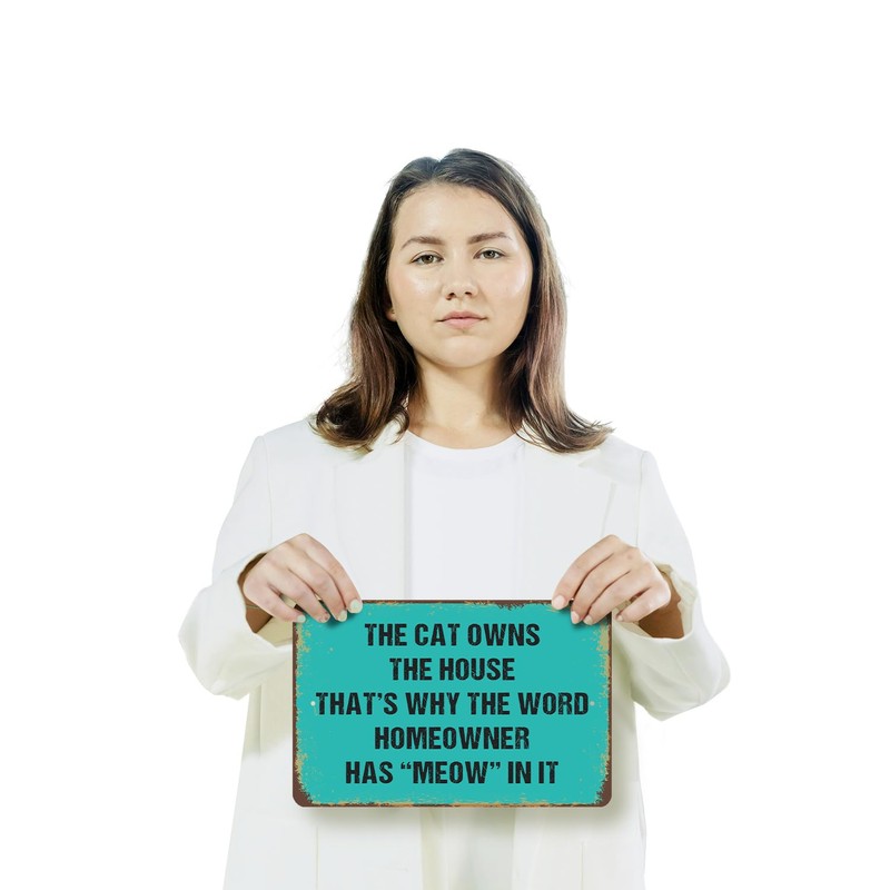 The Cat Owns the House Homeowner Has Meow in It 8 Inch x 12 Inch Novelty Plastic Sign Durable Weatherproof UV Protected Perfect for Cat Rooms Homes Fun Gift for Cat Lovers Crafted in the USA