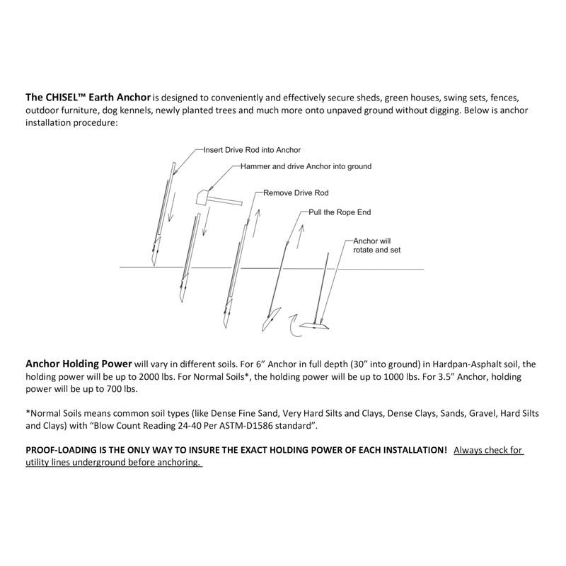 - Just pound it into ground and pull; Suitable for all soils; Holding power for EACH Anchor will be up to 2000 lbs when installed at full depth