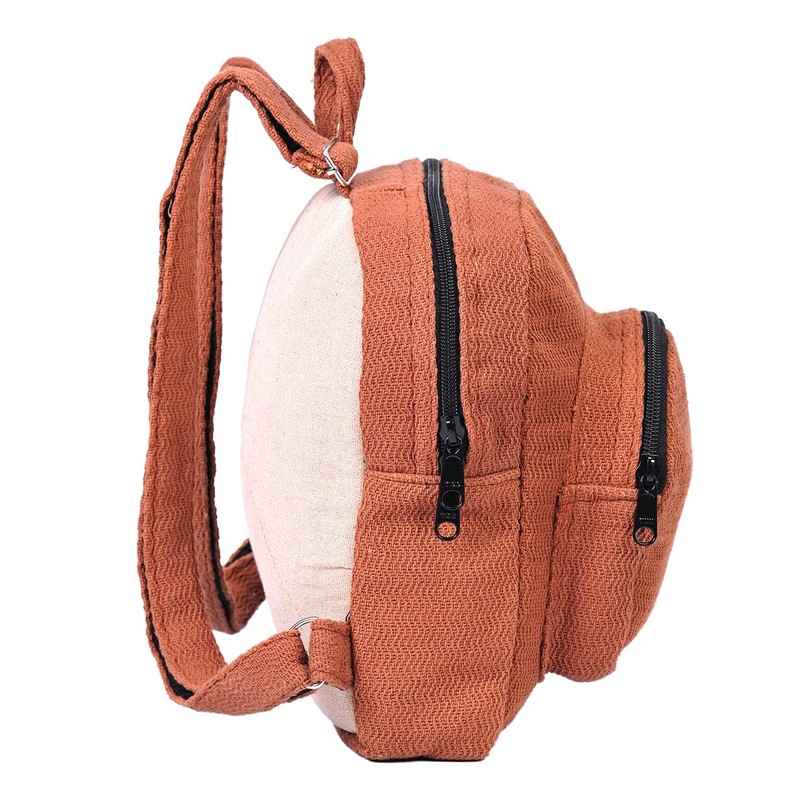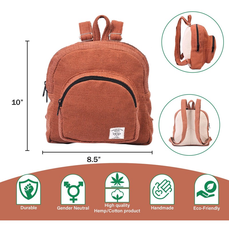 - Our handmade cotton and hemp backpack purse is made from natural cotton and Himalayan hemp. This mini boho backpack has inner lining for extra durability, tear resistance, and protection. The bag measures approximately 10" H x 3" D x 9" W with adjustable straps.