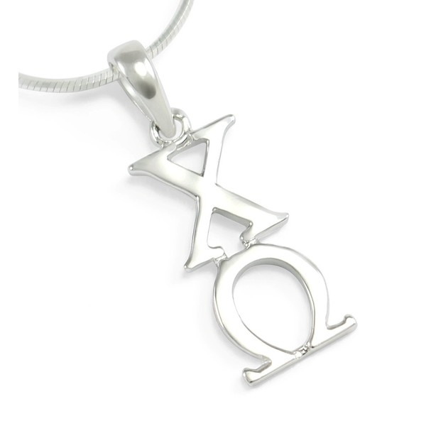 A sweet and simple sterling silver Chi Omega lavaliere pendant with Chi Omega Greek letters. Finished with rhodium for a brilliant, lasting shine. A classic design.