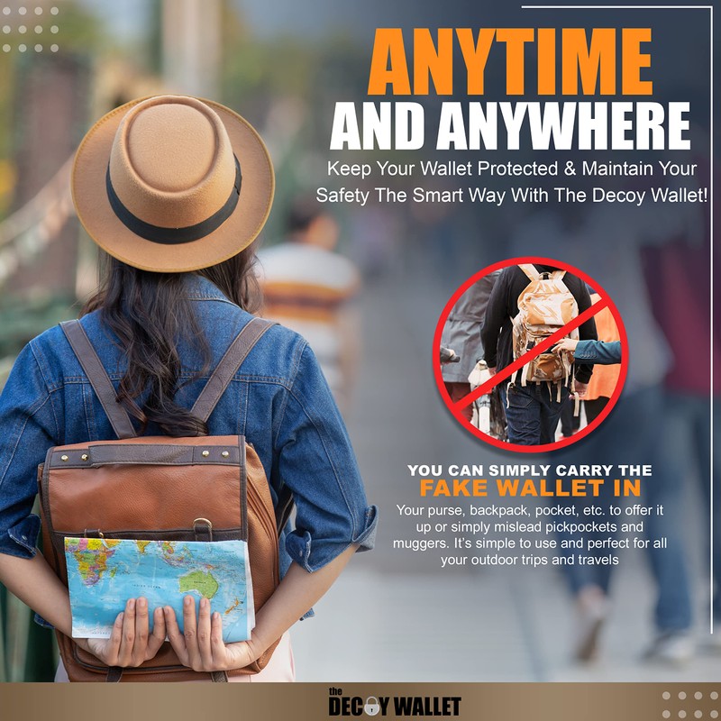 Description"At Decoy Wallet, we have made it our mission to make traveling safer and more enjoyable for people worldwide. We know you have probably tried out a lot of seemingly safe options to protect your cards and cash from pickpocketing but so far to no avail. Instead, we propose an effective if not traditional solution to keeping thieves away and your cash safe: our amazing decoy wallet! There is no complicated technology behind it: all you must do is act careless with your fake anti-pickpocket wallet and keep your real valuables safe elsewhere. It's a simple and failproof solution that keeps you and your family out of trouble.Discover Our Faux Decoy WalletWhat makes our decoy wallet truly stand out is its authenticity. Unlike a regular, empty wallet, ours comes with 6 fake cards that ensure a more realistic look. They convincingly simulate various card types like gym, library, business, and credit cards. Additionally, we have made sure that the name on the card is unisex so everyone can use this decoy wallet. Whether you're exploring tourist spots or simply going about your day, this street-smart wallet is designed to keep pickpockets and muggers at a distance so you have peace of mind.Here are a few things to keep in mind about our pretend wallet:1. Unique wallet designed as a decoy for safety2. Includes 6 realistic-looking fake cards3. Unisex names suitable for both men and women4. Provides protection against pickpockets and muggers5. Ideal for travel or everyday use6. Slim, lightweight, and travel-friendly design7. Can also be used in role-playing games8. It serves as a practical at-a-glance thief deterrent9. Unique and fun gift optionEnjoy more safety while traveling with our amazing decoy wallet for men and women!"