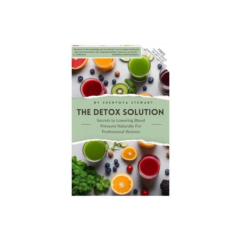 The Detox Solution: Secrets to Lowering Blood Pressure Naturally For Professional WomenDiscover the secrets to lowering your blood pressure naturally with The Detox Solution, your comprehensive guide to taking your health back into your hands and gain optimal health. In this essential read, Shentoya Stewart draws upon over 12 years of experience as a Master Herbalist and Nutritionist to bring you through this step-by-step journey towards mastering Hypertension.Why This Book?In a world flooded with health information and fads, The Detox Solution stands out by offering a simple step by step guide to detoxing your body and getting your blood pressure back in check. You'll find no quick fixes hereDjust precise solutions that focus on fundamental nutrition & overall mental well-being.Inside, You Will Discover: The Gateway to Renewed Health: Learn what it takes to make better lifestyle choices and gain the strength to overcome hypertension. How to Glow From the Inside Out: Uncover the truth about detoxing your body through juicing and how you can effectively lower your blood pressure naturally. Who Should Read This Book?Whether you're dealing with hypertension, worried about your risk, aiming to manage your weight and stress, alleviate headaches & fatigue, or simply enhance your overall well-being, The Detox Solution provides invaluable insights and practical advice to guide you on your path to better health.