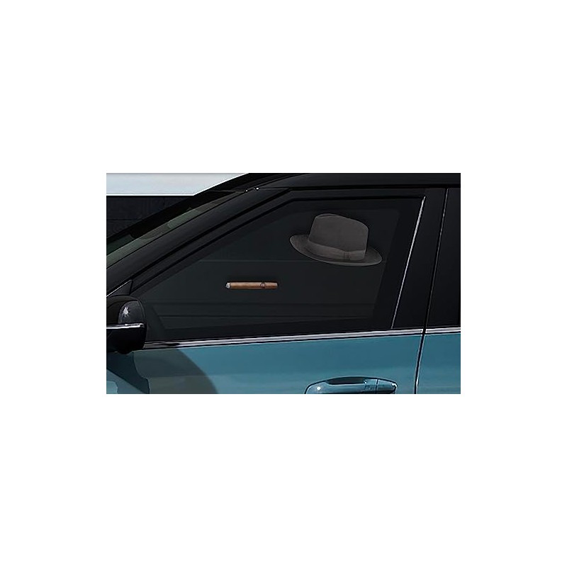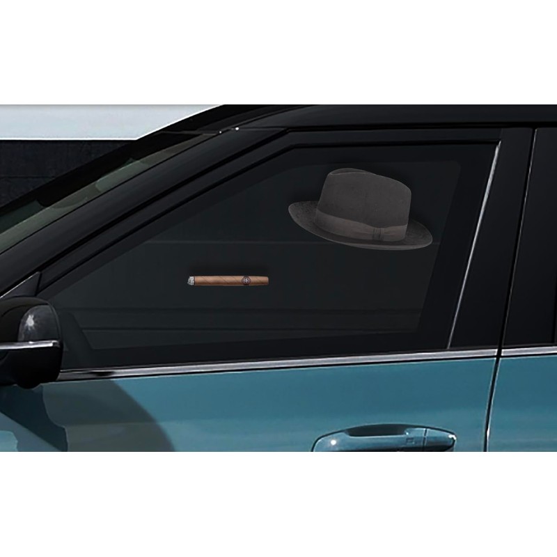 Driving Crooner Fedora and Cigar decal. Fedora measures 9.5", Cigar Mesasures 6" Machine Cut, (That's the Stanzo Difference!) Waterproof Laminated Vinyl Sticker paper. Easily removeable. My goal was originally 5 cars, but we're now over 600 Cars currently in our fleet worldwide! (Also a Firetruck)