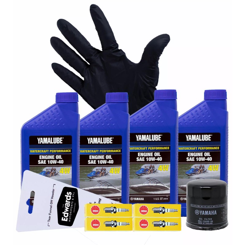 - Includes: four quarts of Yamalube SAE 10w-40 watercraft engine oil, OEM oil filter, four NGK LFR6A spark plugs, Edwards funnel, and pair of nitrile gloves
