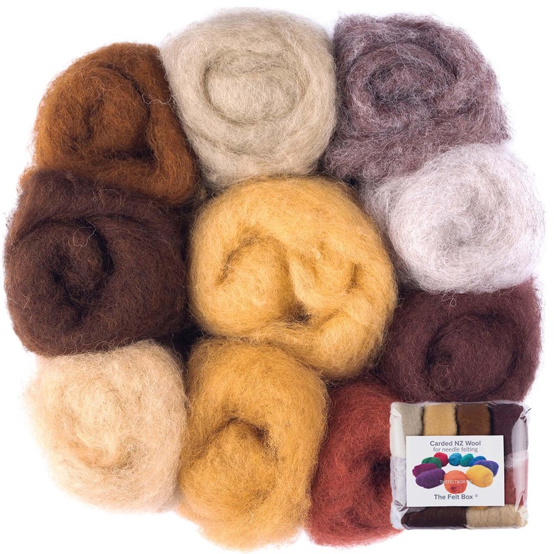 - BROWN BEIGE CARDED WOOL FELT 100g / 3.5 Oz, approx 10 g of each colour. You will get a lovely selection similar to the picture.
