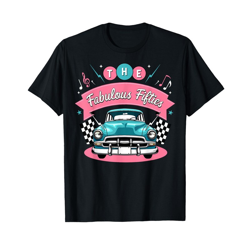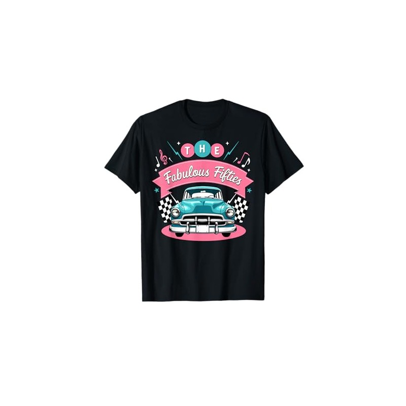 - Take a step back in time with this stylish tribute to the iconic 1950s. Featuring a classic car and musical notes, this design captures the essence of a truly nostalgic era. Great idea for 50s costumes for women and 50s outfit for women