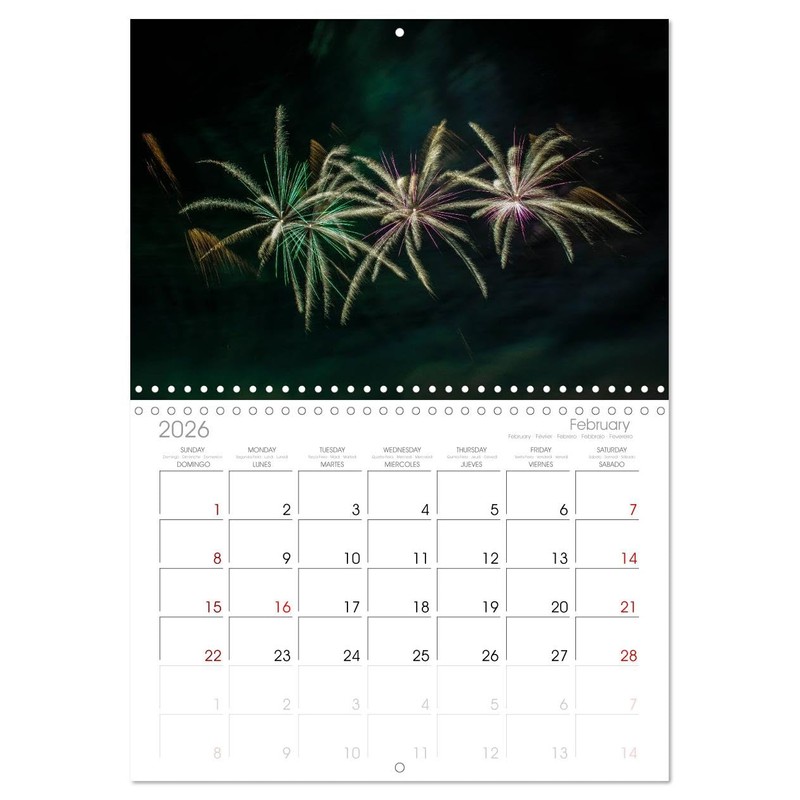 - 12 unique pictures, large monthly grid for planning with dates in 5 languages, including Spanish and French. 14 Month Calendar (Jan 2026 - Feb 2027).