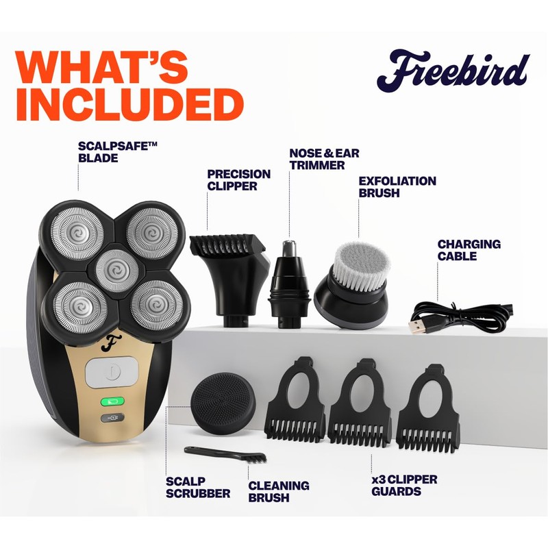 - FLEXSERIES SHAVER - The revolutionary FlexSeries Shaver from Freebird, previously Freedom Grooming, is the only thing you need to keep your head clean and smooth-shaven while remaining bump and irritation-free! This durable 5 blade rotary razor has soft alloy blades featuring Advanced Anti-Bump technology, making it safe, easy to use, and convenient while shaving your head and body. Replacement blades are available.