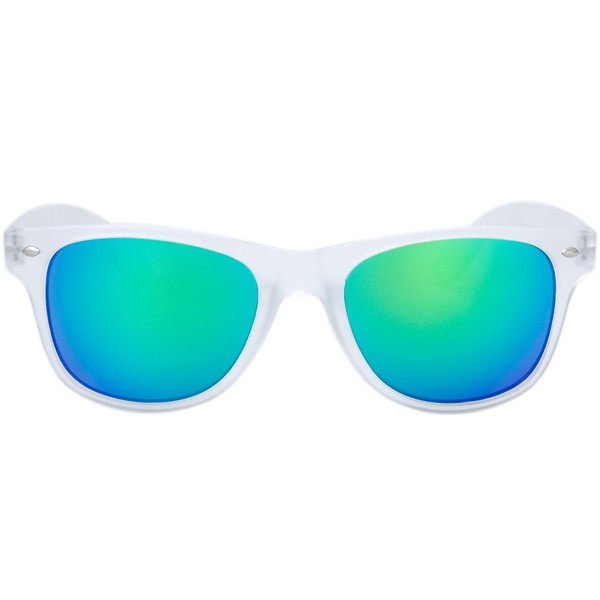 - Iconic Horn Rimmed Design: Embrace fresh mood everyday! Extra standout in a matte frosteds frame, the sunglass is highlighted with reflective colored mirror lens to get you spotted for cool beach side and high-street styling.