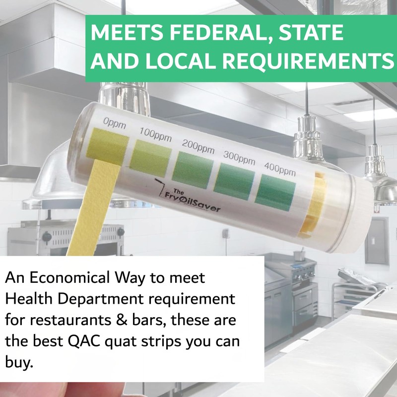 • PRECISE AND EASY QUAT TESTING WITH QR5 STRIPS - Ensure accurate monitoring of quaternary ammonium sanitizer levels with QR5 Test Strips by The FryOilSaver Co. Each kit includes an easy-to-use color comparison chart for quick and reliable interpretation. Simply dip a strip into the solution, wait 5C10 seconds for the color to develop, and match it to the chart to determine the parts per million (ppm). With a measurement range of 0 to 500ppm, these test strips are perfect for maintaining safety and compliance in food service settings, including restaurants, bars, kitchens, food trucks, and more.