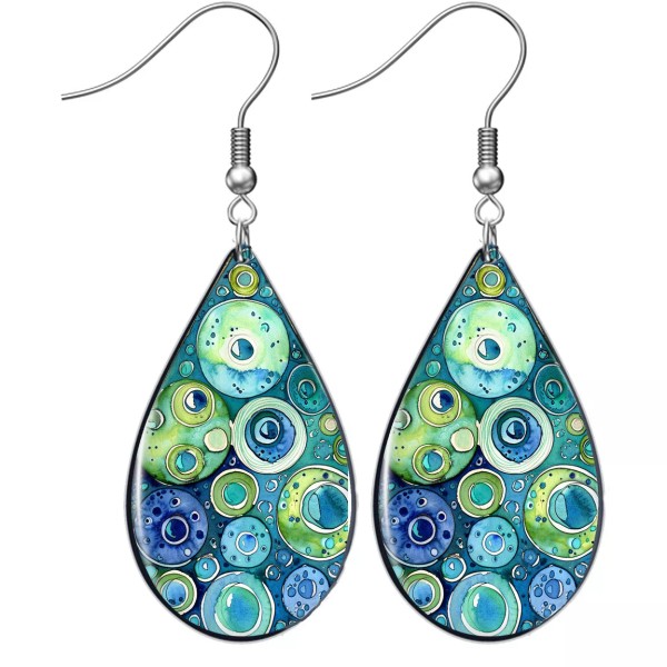 the fun things Abstract Teal Blues Bubbles Earrings Wood Teardrop Dangle Sterling Silver Wires