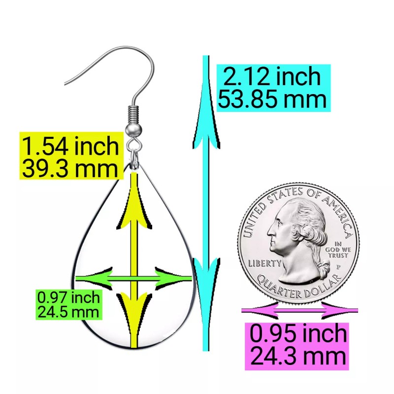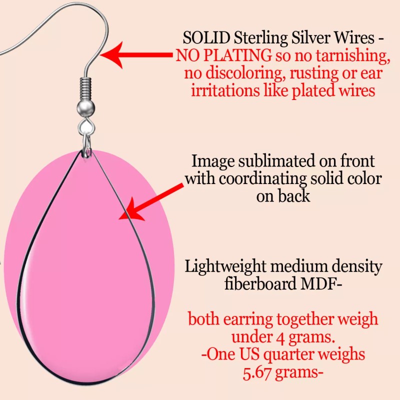The original artwork is printed using an Epson Ecotank professional photo printer with top quality dye-sublimation ink on HTVRONT sublimation paper. The image is then cut to size and professionally heat pressed onto the prepared medium density fiberboard (MDF) wooden teardrop shapes. The image is sublimated on the front with a coordinating solid color on the back.