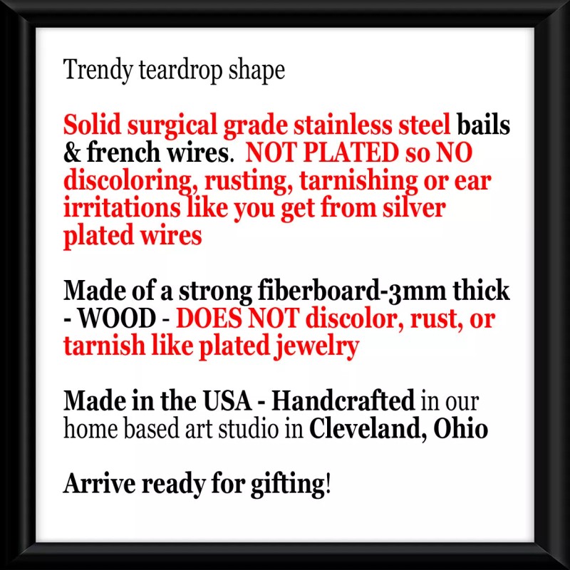 Say "Goodbye" to over priced plated jewelry! These have stainless steel bails & stainless steel wires along with the wooden earrings which means NO PLATING. AND NO PLATING MEANS - NO TARNISHING, DISCOLORING, RUSTING, OR EAR IRRITATIONS LIKE YOU GET FROM CHEAP PLATED JEWELRY.