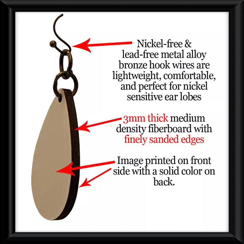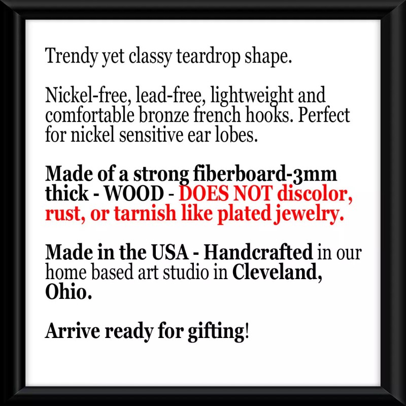 Say "Goodbye" to over priced plated jewelry! These are wooden earrings which means NO PLATING. AND NO PLATING MEANS - NO TARNISHING, DISCOLORING, RUSTING, OR EAR IRRITATIONS LIKE YOU GET FROM CHEAP PLATED JEWELRY AT NEARLY TWICE THE PRICE.