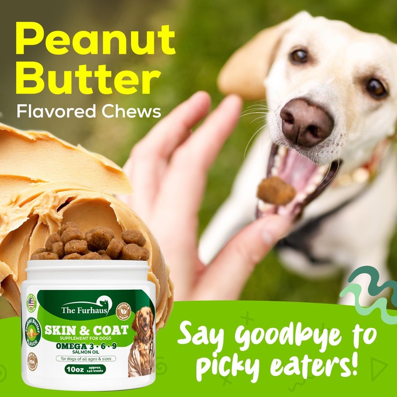 The Furhaus Omega 3 Skin and Coat Chews for Dogs – 10Oz Supplement with Salmon Oil, Vegetable Blend – Peanut Butter Flavored Dog Itch Relief Vitamins for Itchy Skin