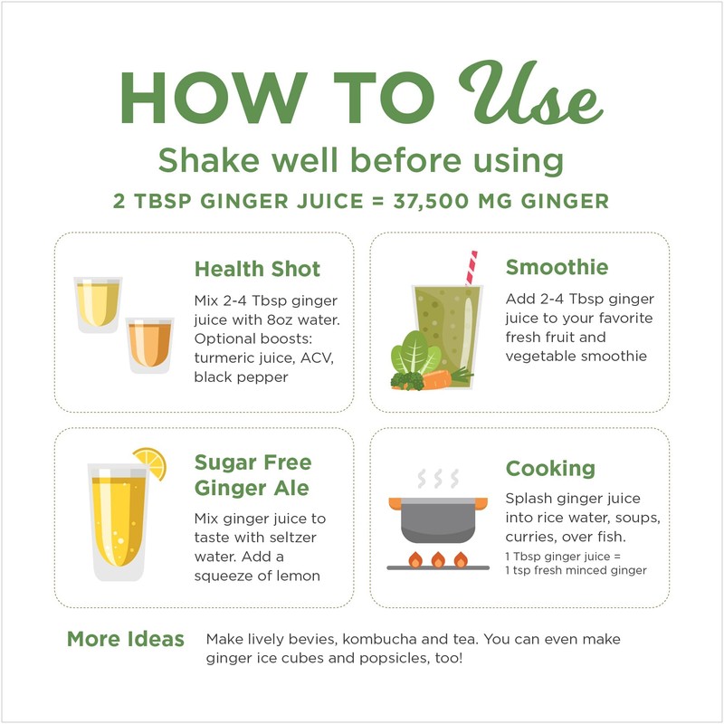 - Perfect time-saving alternative for the foodservice professional. No need to peel or chop anymore. Organic ginger juice is the perfect alternative to fresh or ground ginger.