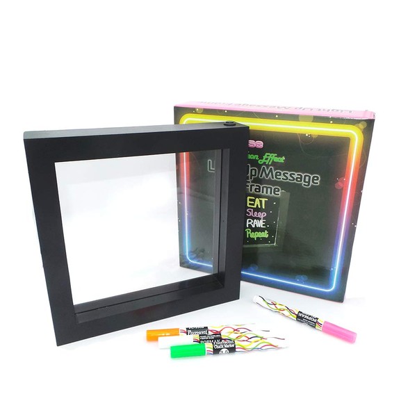- Use the neon pink, orange, white and green pens to scribble your thoughts on the clear glass centre, before flicking a switch in the frame and watching them erupt into a blaze of vibrant colour! Once you’re done with that message, simply wipe the Neon Effect Message Frame clean, with a cloth!
