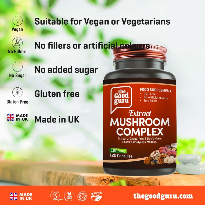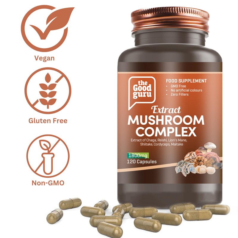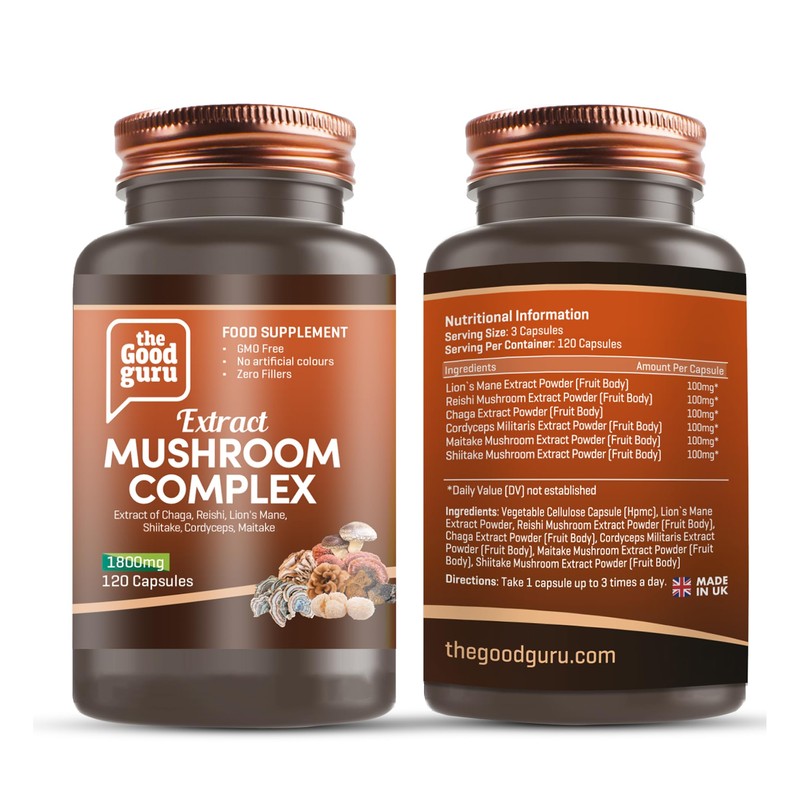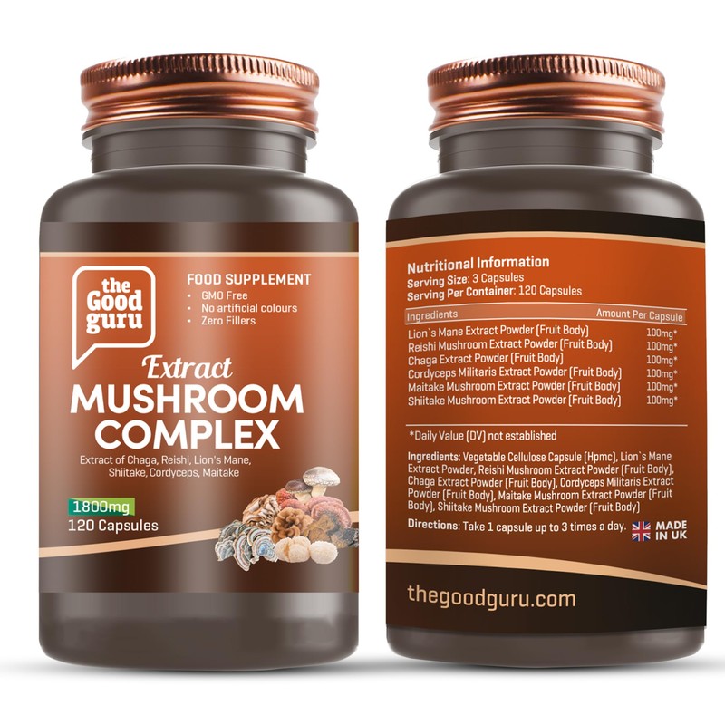 The Good Guru Mushroom Complex Extract Capsule Supplement -1800mg -120 Capsules | Chaga, Reishi, Lion's Mane, Shiitake, Cordyceps | Mushrooms Supplement Capsules