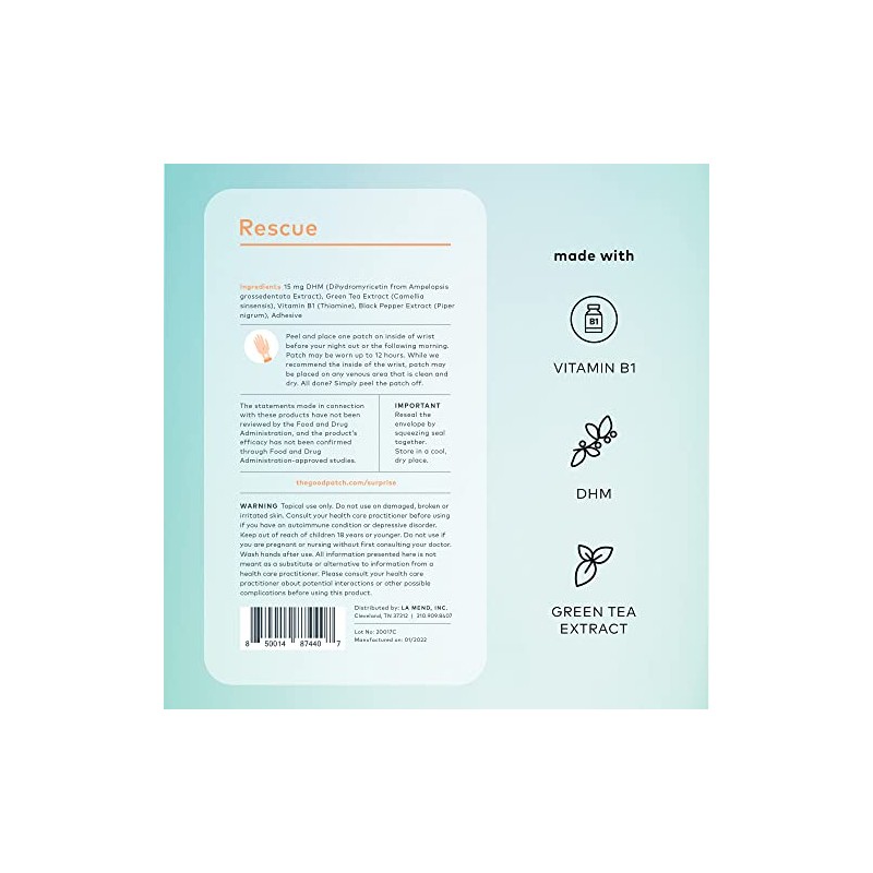 - SAVE YOUR DAY: The essential Rescue Patch with Green Tea, Vitamin B1, and Black Pepper will help you bounce back from a night out so you won't miss a beat. Use after a bachelor or bachelorette party or late night out and get on with your day.