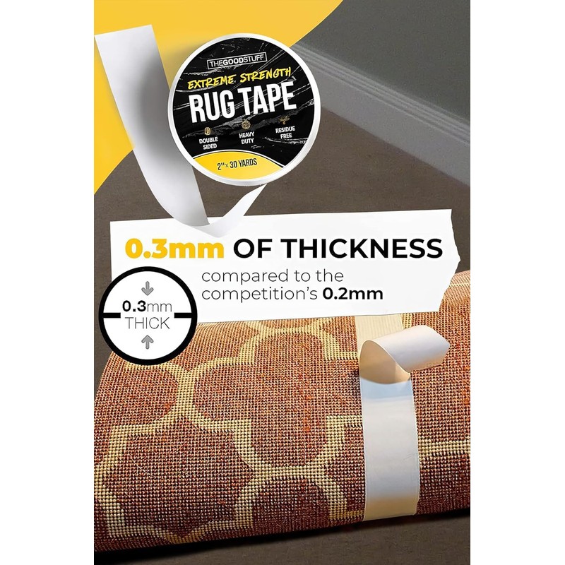 Keep your family safe from tripping hazards with the strongest carpet and rug tape on the market. With 50% thicker tape than the competitors, The Good Stuff Essentials rug tape for hardwood floors, is durable but comes off without residue or harming your delicate surfaces.