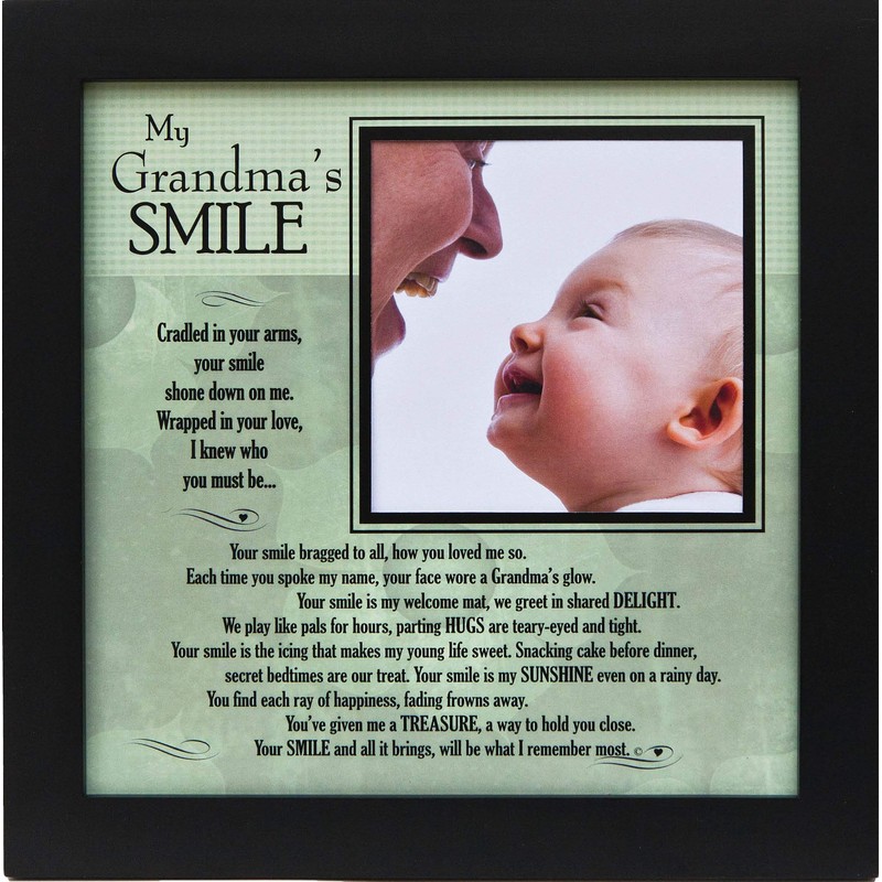 - Black classic wooden 8x8 photo frame that features a 4x4 photo opening for a picture of grandma and her grandchild. The “My Grandma’s Smile” poem is printed on an eye catching design that stands out from the competition.