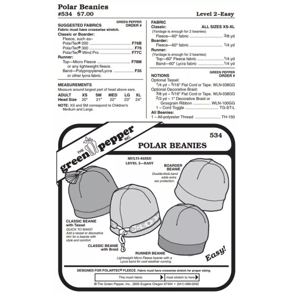 The Green Pepper Inc. Fleece Polar Beanies Winter Hats Headwear #534 Sewing Pattern (Pattern Only)
