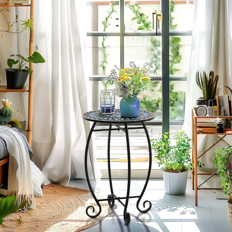 - This indoor side end table offers a stunning blend of colorful ceramic tile tabletop with classic black metal scrollwork frame, making a perfect addition to your home and adding a touch of charm to your room.