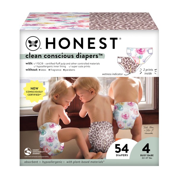 The Honest Company Clean Conscious Diapers | Plant-Based, Sustainable | Wild Thang + Rose Blossom | Club Box, Size 4 (22-37 lbs), 54 Count