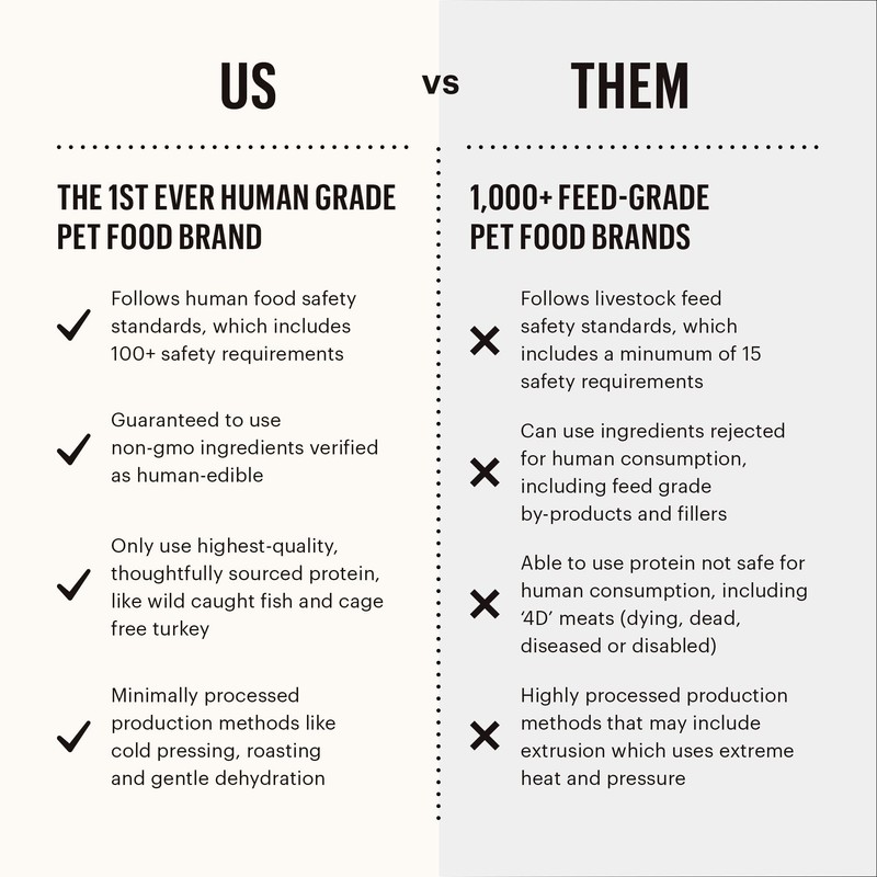 - NO COMPROMISE ON QUALITY: We prioritize your pet's health by saying no to feed grade ingredients, meat meals, and artificial preservatives. Our human grade dog food is crafted to provide only the best nutrition without compromise