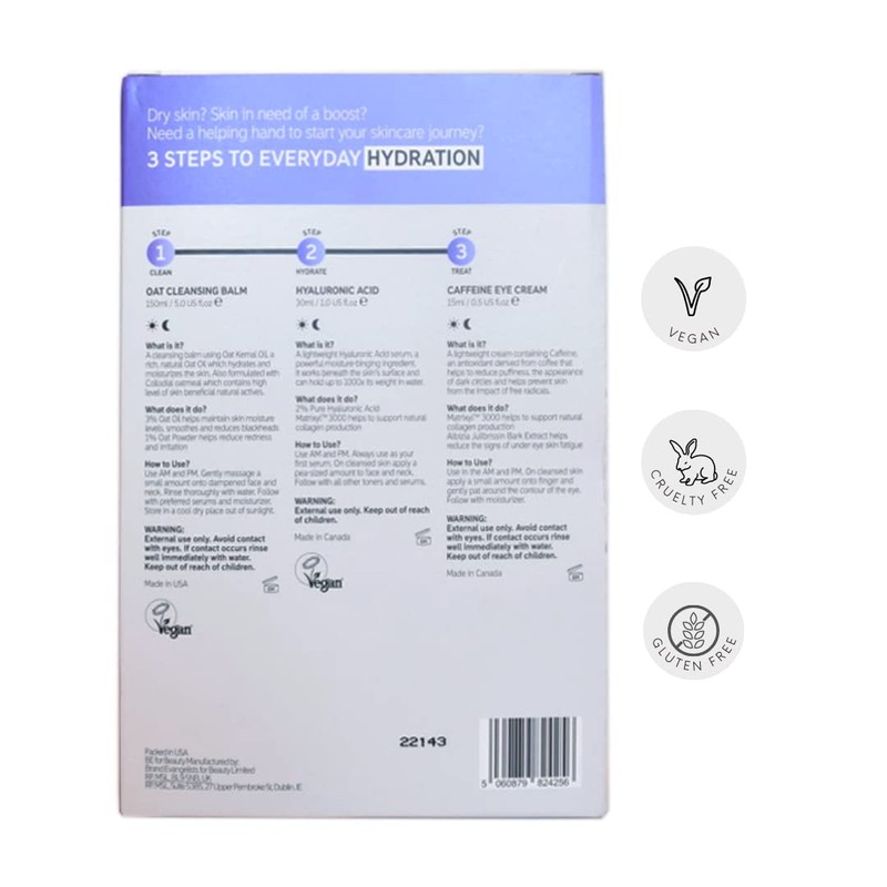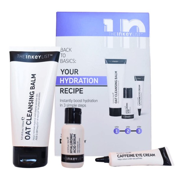 This is a set of three full-size products for intense hydration, including Oat Cleansing Balm, Hyaluronic Acid Hydrating Serum, and Caffeine Eye Cream.