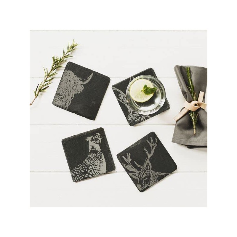 - ENGRAVED COASTER SET, COUNTRY ANIMALS – The Just Slate Company Set of 4 Square Slate Coasters make a lovely table piece for guests to set their drinks on. Each coaster has been engraved with a different stunning country animal. The set includes 1 engraved Highland cow, 1 engraved stag, 1 engraved hare, and 1 engraved pheasant. They measure 4.33 inches by 4.33 inches.