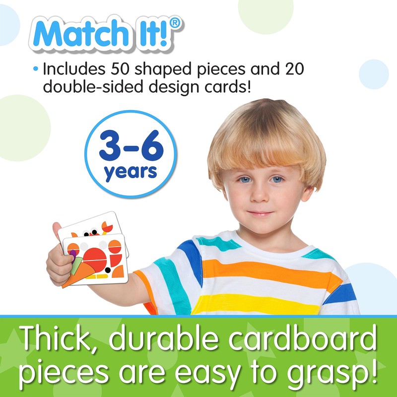 - KEY FEATURES - Kids of all ages will find Match It! Tangrams fascinating as they are challenged to create designs from geometric shapes. The consists of 50 shaped pieces and 20 double-sided design cards to create fun designs like a turtle, crab, dog, and more! Designs vary in skill level and introduce the concept of fractions. Kids simply pick a card, select the shapes necessary to build it, and piece it together. Cards measure 4.0" x 2.75". Ages 3-6 years.