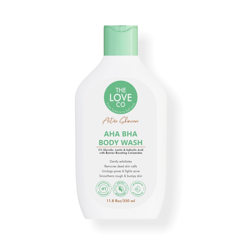 THE LOVE CO. AHA BHA Body Wash | 5% Glycolic, Lactic & Salicylic Acid | Gently Exfoliates, Fights Acne & Unclogs Pores | With Barrier-Boosting Ceramides | Sulphate-Free | Unisex | 350ml