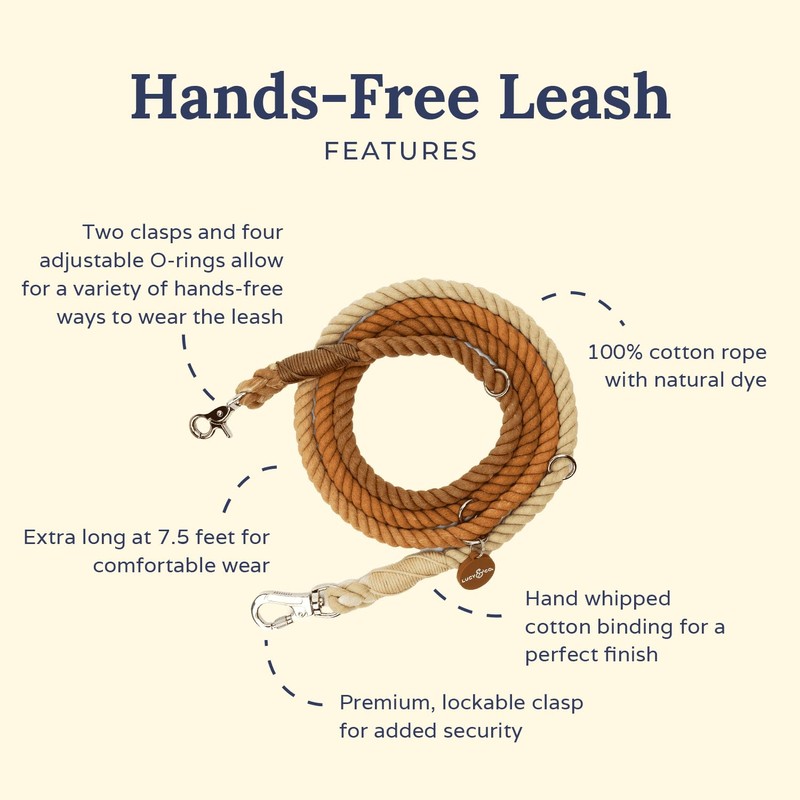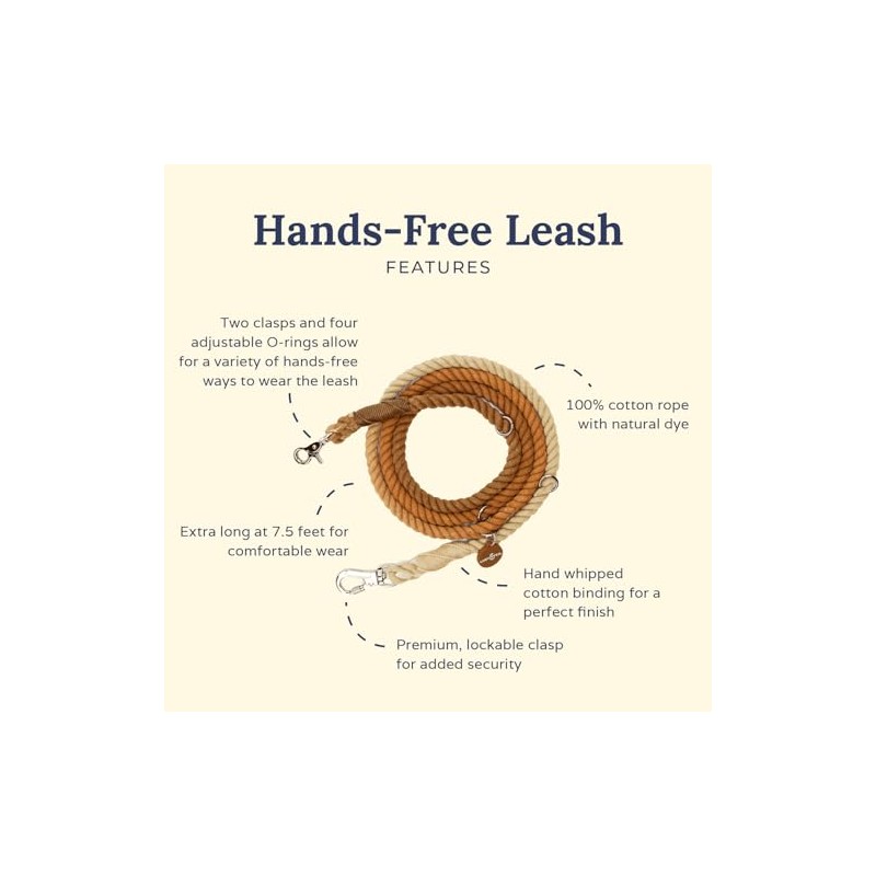 - With two separate clasps, our hands-free leash features our signature lockable clasp for added security and an easy on off clasp for quick adjustments on the fly.