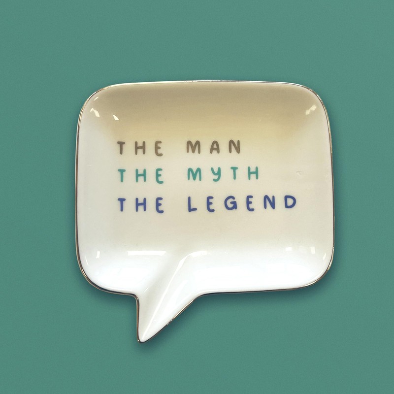 - Details: This charming ceramic trinket tray, designed by Love Kate's, features a whimsical speech bubble design with the phrase "The Man The Myth The Legend." It’s a thoughtful keepsake that blends style and sentiment, perfect for holding his everyday essentials and showing just how legendary he really is.