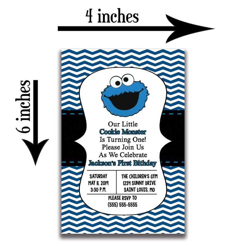 - [PREMIUM PARTY INVITATIONS] These Cookie Monster invites measure 4" by 6" and are printed on a heavy-duty card stock paper which are individually inspected. The fun Cookie Monster design makes this stationary set like none other, ensuring your guests will be impressed when they receive their party invitation.